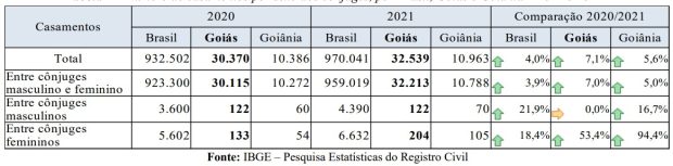 Já nos casamentos de pessoas do mesmo sexo, foi registrado um aumento de 27,8% entre os anos considerados. Em Goiânia, a variação do número de casamentos foi ligeiramente diferente, com aumento de 5,6% nos casamentos registrados. Houve aumento de 5,0% no total casamentos entre pessoas de sexos opostos.