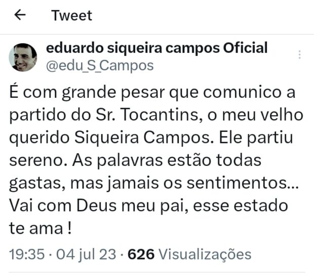 O filho Eduardo Siqueira Campos, ex-prefeito de Palmas, publicou a informação em seu perfil no Twitter: