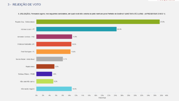 O Opção Pesquisas aferiu a rejeição de cada candidato, questionando aos entrevistados “Em qual candidato você não votaria de jeito nenhum para prefeito de Goiânia?”. Rogério Cruz tem a maior rejeição, com 37,5%. Adriana Accorsi não receberia votos de 24,4% dos eleitores. Vanderlan Cardoso é rejeitado por 10,9% do eleitorado. Eleitores que não rejeitam ninguém são 10,8%. Professor Pantaleão tem rejeição de 10,6%. Fred Rodrigues é rejeitado por 10,4% e Sandro Mabel tem rejeição de 8,1%. Os eleitores que rejeitam todos os candidatos somam 5,5%. Matheus Ribeiro tem rejeição de 4,8%. Não sabem ou não opinaram 5,2%.