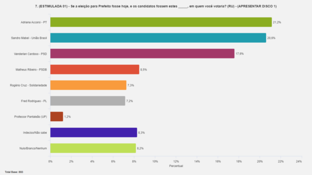 Nesta pesquisa estimulada (em que o nome dos candidatos é apresentado), Matheus Ribeiro (PSDB) surge com 8,5% das intenções de voto, seguido por Rogério Cruz (Solidariedade) com 7,3%. Em sequência, vem Fred Rodrigues (PL) com 7,2% e Professor Pantaleão (UP), com 1,2%. Os indecisos são 8,2% do eleitorado, e os que pretendem votar nulo ou branco também são 8,2%.