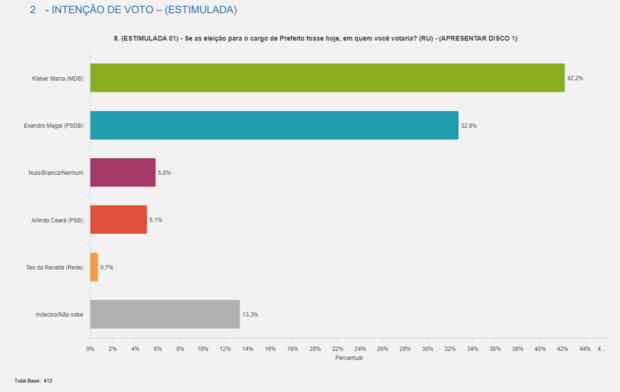 Nesta pesquisa estimulada (em que o nome dos candidatos é apresentado), Evandro Magal (PSDB) surge em segundo, com 32,8% das intenções de voto. Brancos e nulos somam 5,8% das intenções de voto. Arlindo Ceará (PSB) vem em seguida, com 5,1%. Teo da Receita (Rede) tem 0,7%. Indecisos são 13,3% do eleitorado.