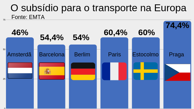 Os subsídios ao transporte coletivo nas principais cidades europeias têm percentuais diferentes, mas, em média, cobrem 50% do valor total. Segundo o European Metropolitan Transport Authorities (EMTA), em Paris, ele chega a 60%; em Berlim, 54%; em Praga, 74% e, em Estocolmo, 60%.