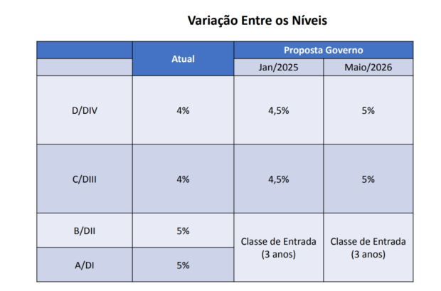 Acerca da contraproposta do governo, os professores reclamam que o acordo não dá reajuste salarial, o que só será escalonado a partir de 2025, com 4,5%; e de mais 5% em maio de 2026; conforme tabela.