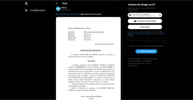 “O ministro Alexandre de Moraes, relator, nos termos da decisão proferida nos autos em epígrafe, manda à Secretaria Judiciária deste Supremo Tribunal Federal proceder à intimação, por meios eletrônicos, de Elon Musk, da decisão proferida nos autos em epígrafe em 18/08/2024, que determinou a indicação, no prazo de 24 (vinte e quatro) horas, do nome e qualificação do novo representante legal da X Brasil em território nacional, devidamente comprovados junto à JUCESP, sob pena de imediata suspensão das atividades da rede social ‘X'(antigo Twitter) até que as ordens judiciais sejam efetivamente cumpridas”, afirma o documento.