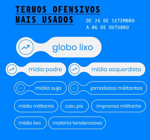 Além disso, independentemente do posicionamento ideológico de cada veículo, portais que divulgaram matérias criticando certos candidatos recebem agressões principalmente associando-os à esquerda. O estudo também aponta para o uso frequente dos termos: “fora comunismo”, “mídia militante”, “esquerda lixo”, “mídia esquerdista” e “caiu o pix”. Ou seja, insinuam um jornalismo vendido aos interesses de partidos políticos.