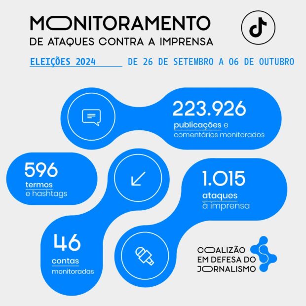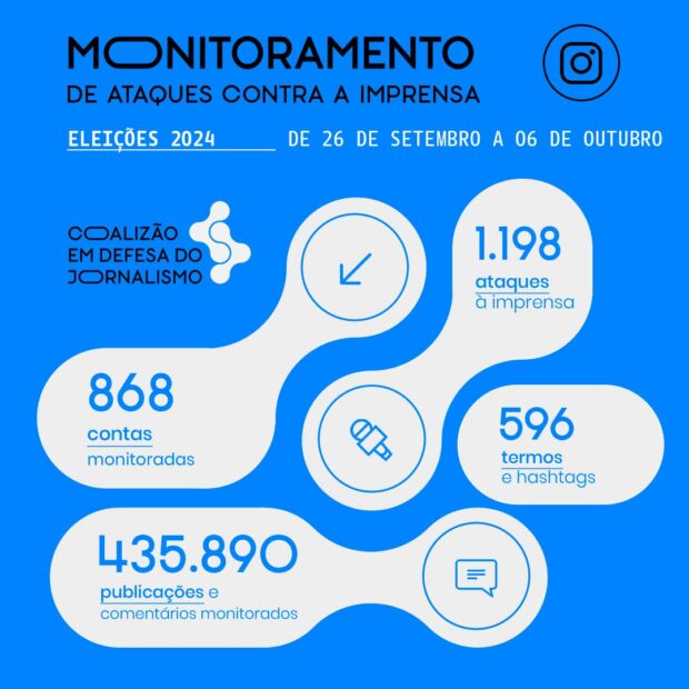 A Coalizão em Defesa do Jornalismo (CDJor) realizou um monitoramento de ataques virtuais e presenciais contra a imprensa nas Eleições de 2024. Até o momento, disponibilizaram seis relatórios, referentes a diferentes períodos. O mais recente é do período de 26 de setembro até 6 de outubro, o fim do primeiro turno das eleições municipais.