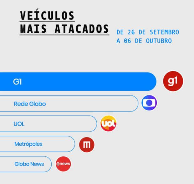 O estudo confirma que conforme a disputa se intensifica, apoiadores e candidatos respondem à imprensa com ataques e ofensas aos jornalistas e meios de comunicação. A hashtag mais utilizada contra a imprensa foi #globolixo, nas três plataformas analisadas, o que indica ataques articulados em diversas plataformas.