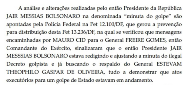 Em uma mensagem enviada por Cid ao general Freire Gomes, aponta que Bolsonaro estaria sofrendo “pressões para tomar uma medida mais pesada”, com o uso de forças, por parte de “deputados”. A investigação também aponta que Cid indicou que Bolsonaro “enxugou o decreto” e o tornou “mais resumido”.