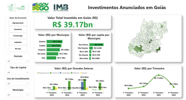 O Governo de Goiás lançou uma plataforma digital para monitorar investimentos no estado. Desenvolvida em parceria entre a Secretaria de Indústria, Comércio e Serviços (SIC), a Secretaria-Geral de Governo (SGG) e o Instituto Mauro Borges (IMB), a ferramenta reúne dados sobre aportes em setores estratégicos, como indústria, comércio, serviços, agropecuária e construção. As informações podem ser consultadas por município, período, tipo de capital (público, privado ou misto) e finalidade do investimento (implantação ou expansão).