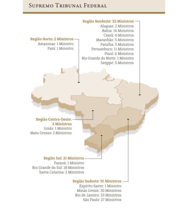 A diferença regional dos ministros da Suprema Corte faz parte do intenso debate sobre a representatividade do Tribunal. A região sudeste concentra 91 indicações, liderados por Rio de Janeiro (33 ministros) e Minas Gerais (30 ministros), seguidos por São Paulo (27) e Espírito Santo (1 ministro). A segunda região com o maior número de indicados é o Nordeste, com 53 ministros.