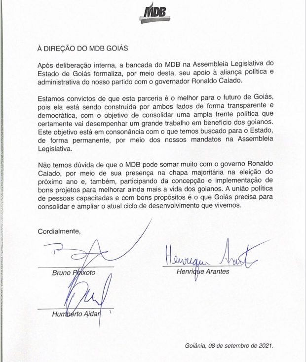 Em carta assinada pela bancada do MDB na Assembleia Legislativa do Estado de Goiás (Alego), os deputados Bruno Peixoto, Henrique Arantes e Humberto Aidar formalizaram apoio à aliança política e administrativa da sigla com o governador Ronaldo Caiado (DEM).
