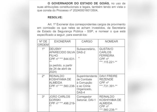 Ainda de acordo com o documento Gustavo Carlos Ferreira, que era delegado regional de Caldas Novas, passou a ser subsecretário da SSP no lugar de Deusny Aparecido Silva Filho. A SSP informou que Deusny pediu para ser exonerado devido a “cuidados com a saúde”. Em relação às demais trocas, a pasta explicou que são “naturais da administração pública”.