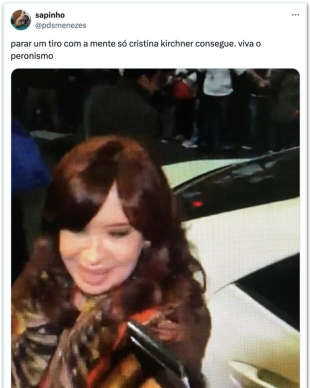 - Outro tweet traz uma foto da ex-presidente da Argentina Cristina Kirchner, também alvo de uma tentativa de assassinato em 1º de setembro de 2022. Na ocasião, o tiro não foi disparado, pois a arma, apesar de estar carregada, não tinha nenhuma bala engatilhada.