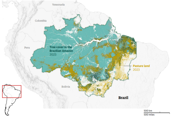 A produção de gado no Brasil é movida, em alguma parcela, pelo desmatamento, principalmente na região amazônica. Em estados como Pará, Rondônia e Amazonas, milhares de hectares são desmatados todos os anos para abrir espaço para a produção de carne bovina. A situação preocupa especialistas, que veem a região passar de um absorvente de carbono para um emissor.