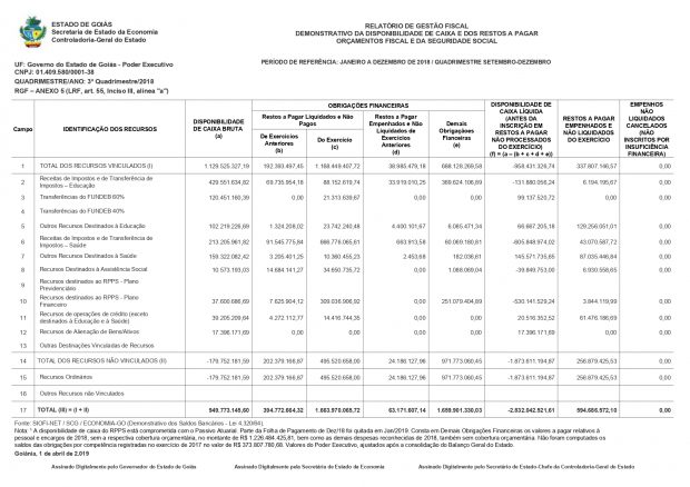 Além da indisponibilidade de caixa e do investimento em educação abaixo do piso constitucional, os relatórios fiscais de 2018 mostram que naquele ano cerca de R$ 2,2 bilhões em despesas ocorreram sem prévio empenho. Na prática, isso pode fazer com que o ente público assuma obrigações em valores superiores à própria capacidade de arrecadação.