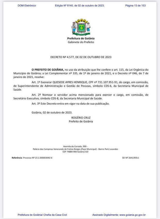 Após ocupar diversos cargos públicos no Tocantins, como ex-secretário de Habitação e ex-secretário-executivo da Secretaria de Estado da Saúde (SES) durante o governo de Mauro Carlesse, além de atuar como Secretário Extraordinário de Ações Governamentais e Parcerias Público-Privadas no governo Wanderlei Barbosa, o administrador de empresas Quesede Ayres foi nomeado como secretário-executivo da Secretaria Municipal de Saúde de Goiânia no dia 2 de outubro de 2023.