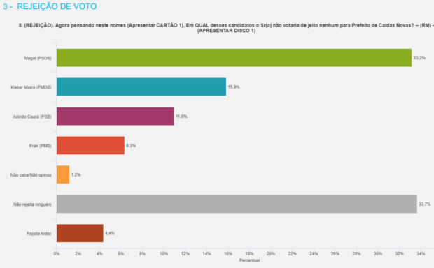 O candidato Evandro Magal (PSDB), que concorre ao cargo de prefeito de Caldas Novas, é o mais rejeitado entre os quatro nomes no pleito municipal, com 33,2%. É o que aponta a pesquisa do instituto Opção Pesquisas, divulgada neste sábado, 5. Em segundo lugar entre os mais rejeitados está Kleber Marra (MDB), com 15,9%.