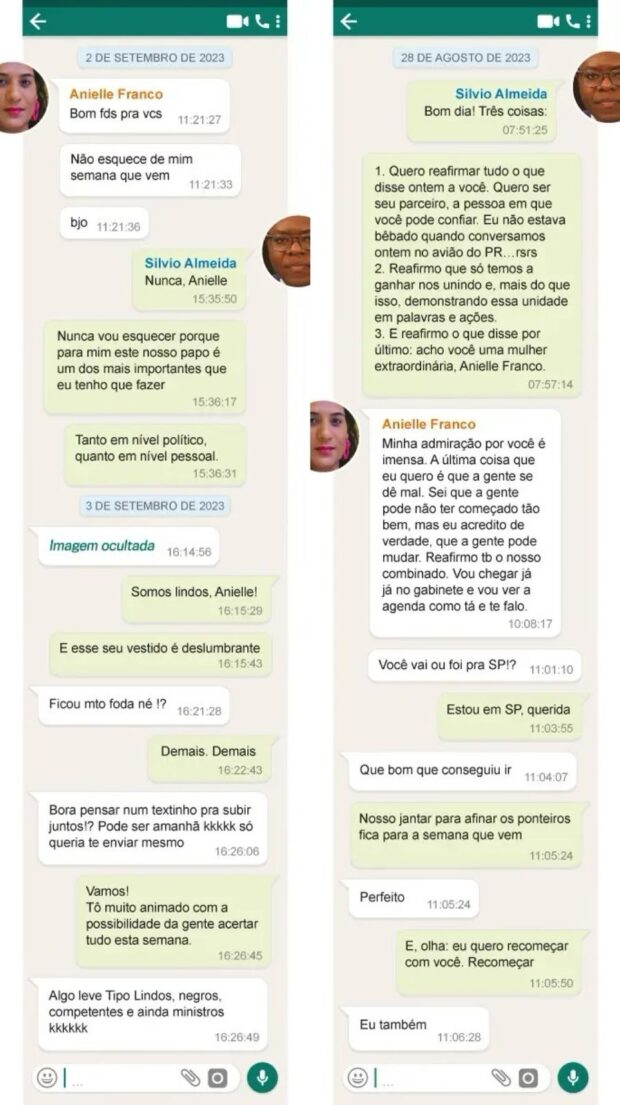 Em outro trecho, Almeida elogia o vestido de Anielle, chamando-a de “deslumbrante”. Já em uma troca de mensagens de 28 de agosto, Almeida reafirmou seu compromisso de ser uma pessoa de confiança para Anielle, além de elogiá-la como “uma mulher extraordinária”. Anielle respondeu que tinha grande admiração por ele e mencionou o desejo de “recomeçar” a relação, apesar de terem tido um início turbulento. As mensagens trocadas entre os ministros vieram à tona em meio às denúncias de assédio contra Almeida.