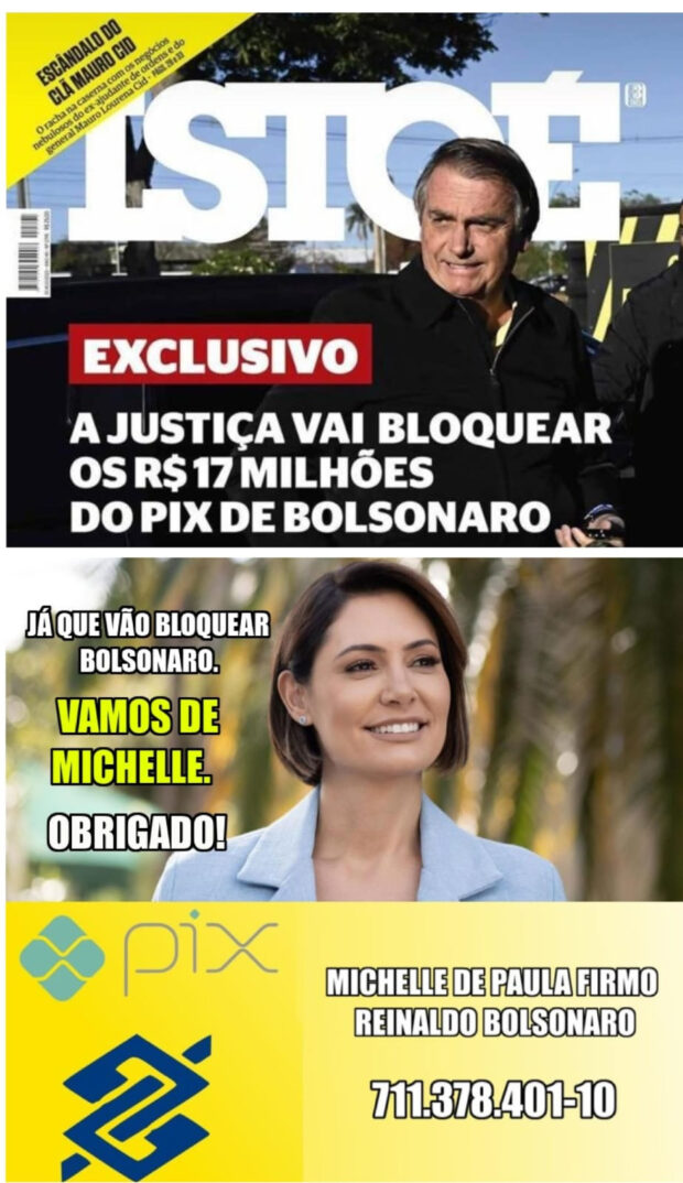 Na imagem divulgada, bolsonaristas fizeram uma montagem com a notícia da revista e uma foto de Michelle com a chave Pix, acompanhada da mensagem: “Já que vão bloquear Bolsonaro, vamos de Michelle. Obrigado!”.