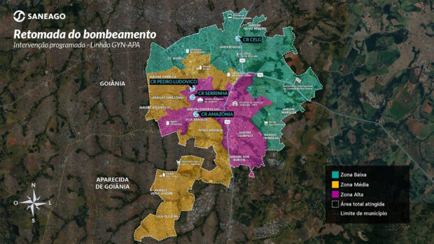Ainda conforme a Saneago, a normalização do abastecimento de água é um processo gradual e ocorre à medida que as redes e os reservatórios são abastecidos com água. Esse processo se inicia pelos reservatórios da zona baixa, em seguida na zona média e, por último, na zona alta. Veja no mapa: