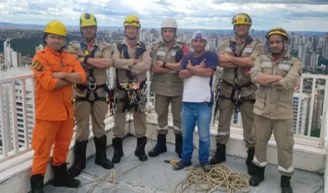 Bombeiros utilizam rapel para resgatar trabalhador preso a 130 metros de altura em Goiânia