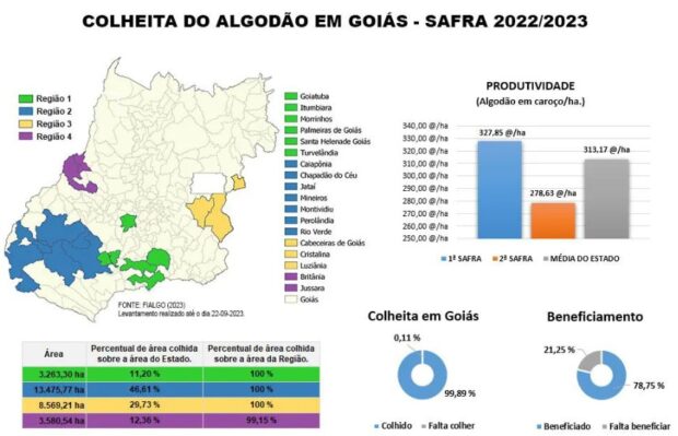 A colheita do algodão em Goiás está concluída toda sua área plantada. Os dados são do Fundo de Incentivo à Cultura do Algodão em Goiás (Fialgo), que acompanha todo o período de colheita nas fazendas produtoras de algodão no estado. Entretanto, problemas que vem atingindo todas as commodities brasileiras também pode afetar o algodão: entraves logísticos e dificuldades de exportação.