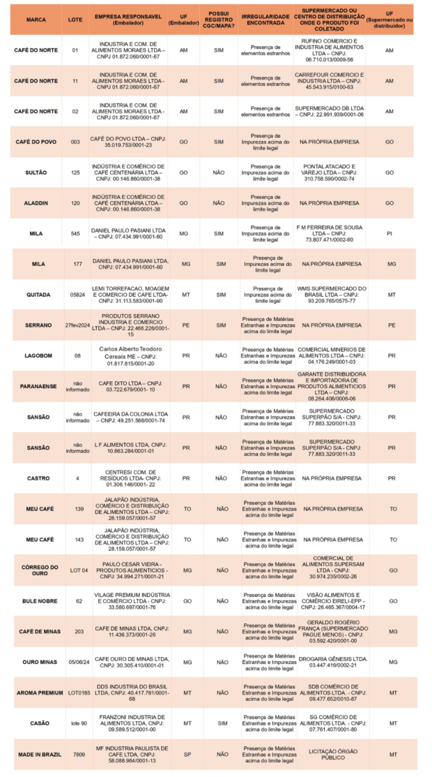 As 16 marcas de café impróprias para consumo são Oba Oba Sorriso, Exemplar, Matão, Belo, Moreno, Pureza, Terra da Saudade, Góes Tradicional a Vácuo, Serra do Brasil, Cambeense, Dourados, Do Norte, Salute, Ivaiporã, Terra da Gente e Dona Filinha.