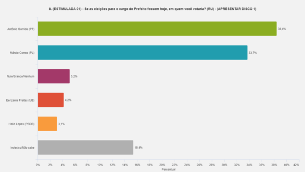 A comparação com o último levantamento do instituto, do dia 15 de julho, revela que o candidato do PL vem se aproximando do líder. Naquela data, Gomide liderava com 38,3% das intenções de voto enquanto Márcio Corrêa tinha 32,5%. A tendência de aproximação dos candidatos já era demonstrada nas pesquisas de maio deste ano.