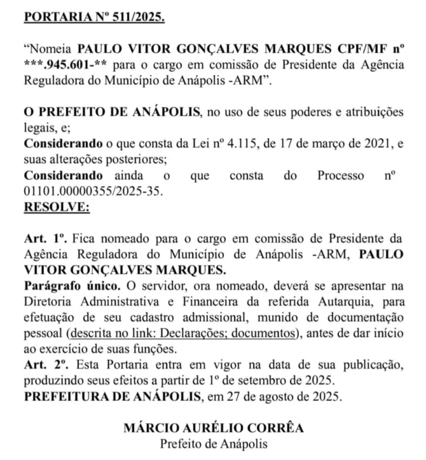 A Agência Reguladora do Município (ARM) de Anápolis terá novo comando. O advogado Paulo Vitor Marques, de 35 anos, foi nomeado pelo prefeito Márcio Corrêa (PL) para a presidência da autarquia. A portaria de nomeação foi publicada nesta quinta-feira, 28, no Diário Oficial do Município.