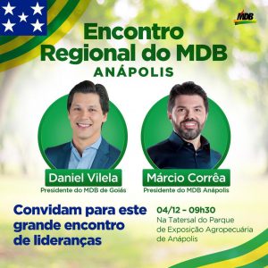 O próximo Encontro Regional do MDB será realizado no sábado, 4, em Anápolis. O evento é coordenado pelo presidente do MDB em Anápolis, empresário e dentista Márcio Corrêa, com o apoio do presidente estadual do partido, ex-deputado federal Daniel Vilela.