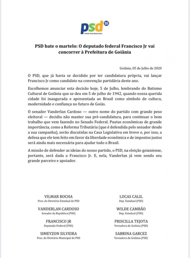 “A missão de defender as ideias do PSD, na eleição goianiense, será dada a Francisco Jr.”, diz nota oficial do partido