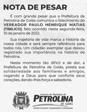 O vereador Paulo Henrique Matias, o Tibilico, faleceu na segunda-feira, 10, aos 28 anos. Segundo um vereador, Tibilico morreu devido a “descarga elétrica”. Ele estava em sua casa, em Petrolina de Goiás. “Ele levou o choque, possivelmente no horário do almoço, mas só foi encontrado à noite. Estava em cima de sua casa [consertando alguma coisa]. Uma testemunha contou que ouviu um baralho, mas pensou que não era nada sério”, afirma uma fonte.