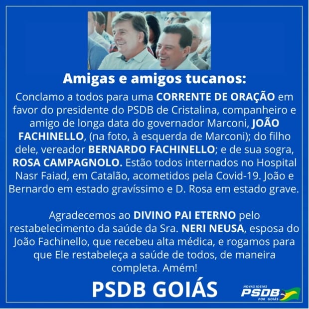 O presidente do PSDB de Cristalina, João Fachinello, seu filho, o vereador Bernardo Fachinello, e sua sogra, Rosa Campagnolo, estão internados no Hospital Nash Faiad, em Catalão, com Covid-19.