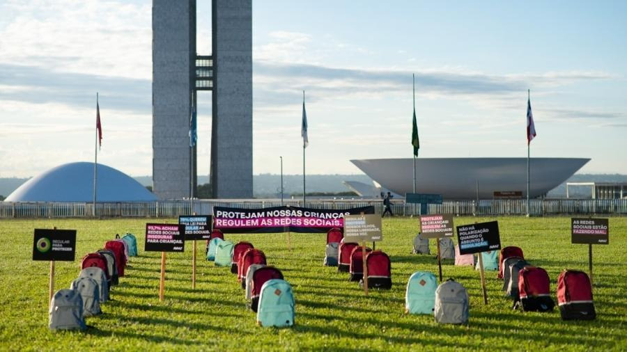 Ato com mochilas lembra vítimas de violência em escolas antes de votação da PL das Fake News