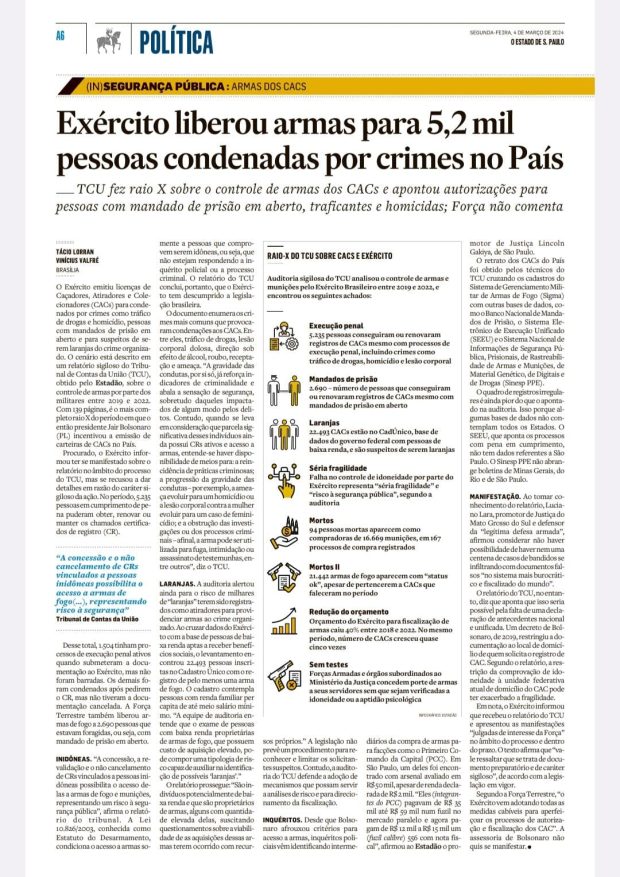 Mais de 1.500 delas estavam em processo de execução penal quando solicitaram as autorizações. Além disso, a Força liberou armas de fogo para 2.690 pessoas com mandado de prisão em aberto, ou seja, que eram foragidas da Justiça. O relatório do TCU destaca que a concessão indiscriminada desses registros representa um risco à segurança pública, indo de encontro ao disposto na Lei 10.826/2003, conhecida como Estatuto do Desarmamento, que condiciona o acesso a armas apenas a pessoas consideradas idôneas, ou seja, que não estejam respondendo a inquérito policial ou processo criminal.