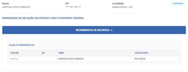 Ariston Costa Cardoso, por exemplo, morador de Damolândia, em Goiás, foi inserido na lista sujo do trabalho escravo por manter trabalhadores em situação análoga a escravidão na Fazenda Conceição, em Campo Limpo De Goiás. O fazendeiro recebeu indevidamente R$ 5.650,00 em auxílios do Governo Federal, o que totaliza 16 parcelas de Auxílio Emergencial.