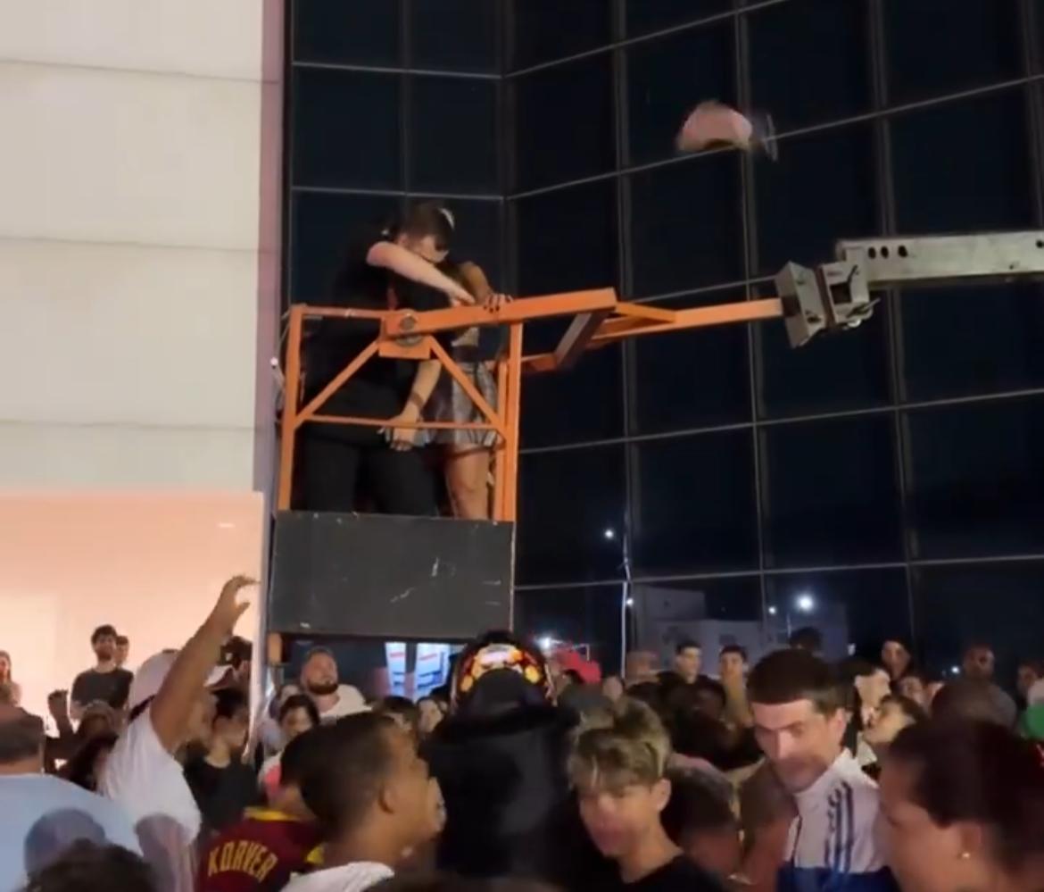 Influenciadora joga R$ 10 mil de guindaste e causa confusão em SC; veja vídeo