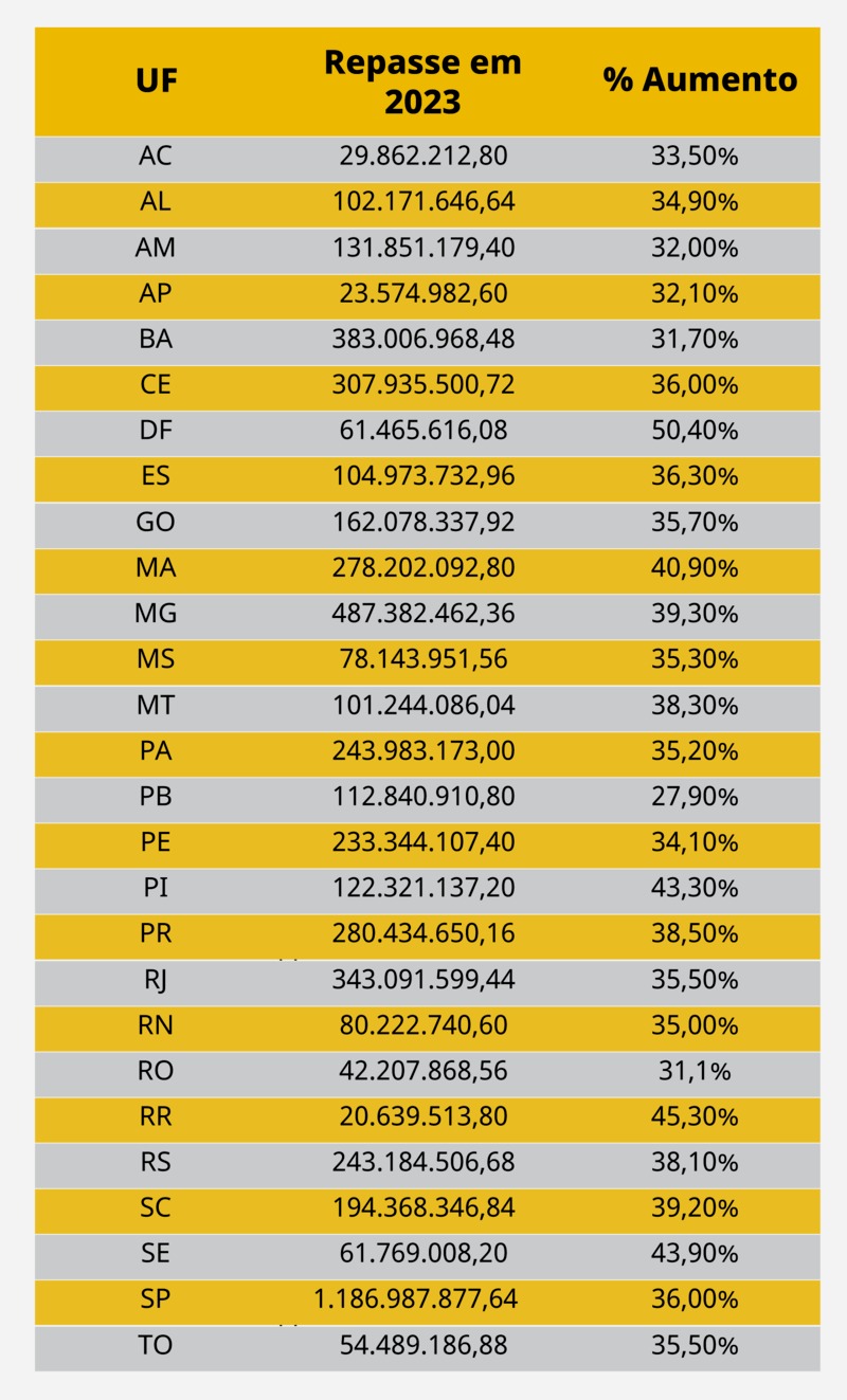 Somando os valores, o Centro-Oeste garantiu mais de R$ 402,9 milhões para seus quatro representantes. No País, o reajuste médio em termos percentuais foi de 36%. Em alguns casos, como o da capital federal, esse reajuste superou em 50% o valor que estava sendo transferido antes. Confira na imagem: