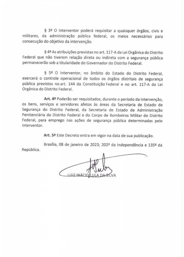 Com a medida, as Forças Armadas poderão atuar para a retomada da ordem pública. “Quem tem que fazer a segurança do DF é a polícia do DF, que não fez. Por incompetência e má-fé das pessoas que cuidam da segurança do DF”, disse o petista ao anunciar a intervenção.