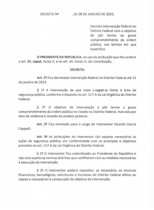O decreto assinado pelo presidente Luiz Inácio Lula da Silva (PT), neste domingo, 8, institui intervenção federal por meio da Garantia da Lei e da Ordem (GLO) no Distrito Federal. A decisão pretende frear a depredação que manifestantes bolsonaristas promovem nos prédios dos Três Poderes.