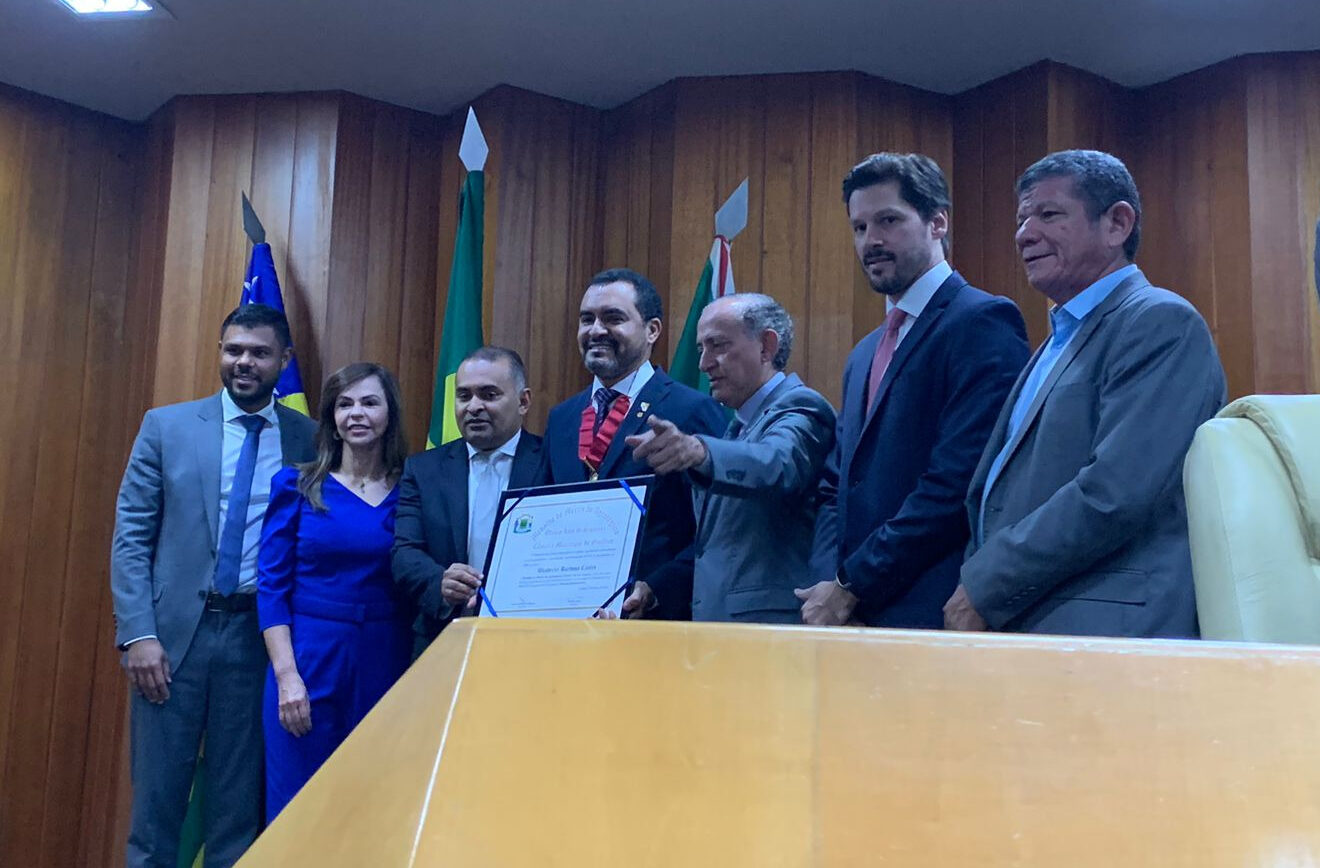 O governador do Tocantins, Wanderlei Barbosa (Republicanos), recebeu nesta terça-feira, 16, a medalha de Mérito do Agronegócio Otávio Lage Siqueira na Câmara Municipal de Goiânia. A homenagem foi proposta pelo vereador Ronilson Reis (PMB), realizada em Sessão Solene, por conta da influência do gestor nos campos da agricultura e pecuária. Durante a cerimônia, ainda estiveram presentes o vice-governador de Goiás, Daniel Vilela (MDB), e a senadora Professora Dorinha (União Brasil/TO)
