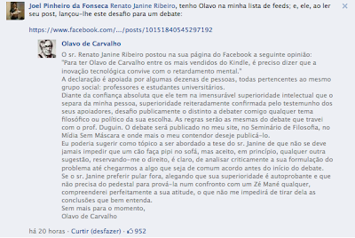 Prestem atenção e digam se não está aí insinuada, com clareza bastante, uma fraude editorial: "E' facil ser mais vendido quando o livro ja nasce com a proposta encomendada de ser best seller e e' comprado aos montes pela mesma elite maluca que sustenta o autor." Quem é "essa mesma elite maluca que sustenta o autor" senão o editor que paga a publicação do livro? Meus alunos é que não podem ser. Agora o sujeitinho mente, dizendo que não insinuou fraude editorial nenhuma, e diz que estou ameaçando processá-lo só para não ter de debater com ele. De fato, não fiz ameaça. Justamente ao contrário: pedi que ele limpasse o aspecto criminal da coisa para que pudéssemos, então, debater. Como bom histérico, ele interpreta a oportunidade como uma ameaça, e já me atribui intenções que nunca tive nem poderia ter. Com toda a evidência, o rapaz sofre de "delírio de interpretação". Nunca ameacei processá-lo: disse apenas que, se ele não me apresentasse desculpas formais, não haveria debate. Insisto neste ponto: assine a declaração que lhe passei, ou desista do debate. Não vou me rebaixar ao ponto de aceitar como interlocutor respeitável um caluniador barato.