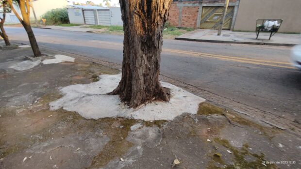 O estrangulamento da árvore com concreto também é uma prática comum que fere o PDAU. Ao não garantir a área permeável sem pavimentação na calçada do imóvel, em torno de cada árvore, o responsável pode responder pela negligência.