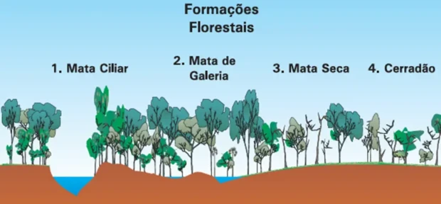 As chamadas formações florestais do Cerrado ocupam áreas específicas onde há maior disponibilidade de água, como às margens de rios, em encostas mais úmidas ou em solos mais profundos. Essas florestas diferem das formações savânicas típicas do bioma (como o campo sujo e o cerrado sensu stricto), e apresentam árvores mais altas, copas fechadas e pouca luz no sub-bosque. A imagem a seguir esquematiza as diferenças estruturais entre estas formações florestais do Cerrado, destacando a mata de galeria, a mata ciliar, o Cerradão e a mata seca.