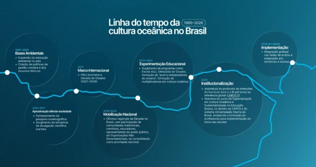 A partir de 2020, no contexto de mobilização da “Década da Ciência Oceânica para o Desenvolvimento Sustentável” (2021–2030), oficinas nacionais realizadas em diferentes regiões do país já indicavam uma convergência clara entre cientistas, educadores e gestores públicos, destacando a necessidade de inserir a cultura oceânica de forma estruturada na educação básica brasileira. Esse processo participativo, que envolveu universidades, escolas, organizações da sociedade civil e comunidades tradicionais, consolidou uma agenda que ultrapassava a divulgação científica e apontava para uma transformação curricular. O resultado foi um movimento inédito que culminou, em abril de 2025, com o Brasil se tornando o primeiro país do mundo a formalizar a inclusão da cultura oceânica em um currículo escolar de alcance nacional, com apoio da UNESCO.