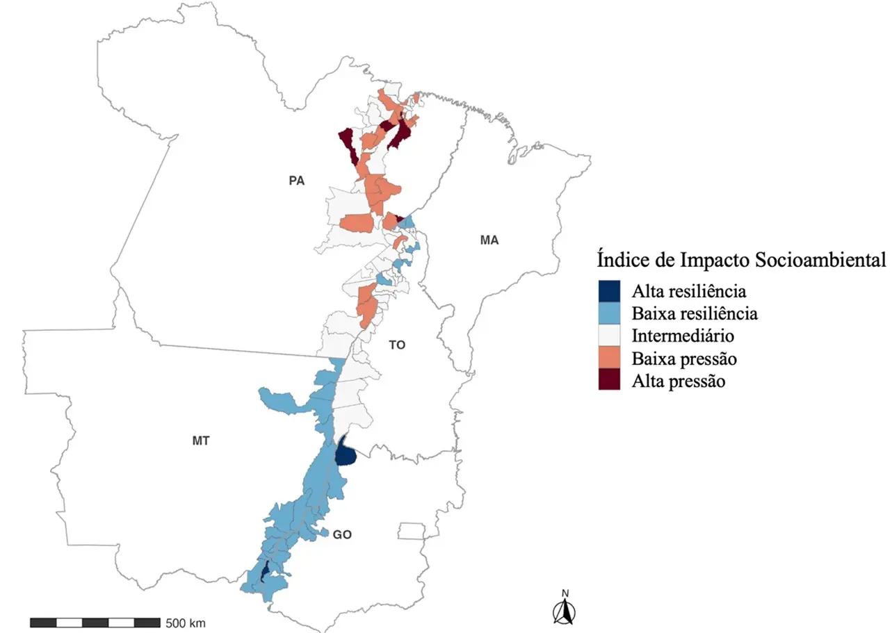 Os resultados revelam um padrão geográfico claro ao longo do corredor. Diversos municípios do Pará, por exemplo, apresentam valores muito elevados do índice, indicando alta pressão socioambiental. Nessas áreas, a vegetação nativa está muito abaixo do que seria esperado dadas suas condições estruturais, o que sugere a atuação combinada de uso intensivo do solo, conflitos fundiários, fragilidade institucional e baixa efetividade da fiscalização. Por outro lado, a transição entre Goiás, Mato Grosso e Tocantins concentra áreas com valores baixos do índice, indicando menor pressão socioambiental e maior resiliência. É nesse trecho que se destacam regiões como a Ilha do Bananal e o Parque Nacional do Araguaia, onde grandes blocos de vegetação nativa ainda se mantêm relativamente contínuos, oferecendo proteção hidrológica, conectividade ecológica e suporte à biodiversidade.
