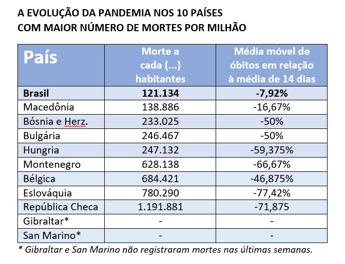 Depois de ultrapassar os Estados Unidos em mortes/milhão no mês passado, o Brasil alcançou o top 10 também em números relativos na pandemia em que é vice-líder de total de vítimas. Ao deixar a Bélgica para trás, o carro fúnebre com Bolsonaro no volante persegue, pela sequência: Eslováquia, Montenegro, Bulgária, Macedônia do Norte, San Marino, Gibraltar, República Checa, Bósnia e Herzegovina e Hungria.
