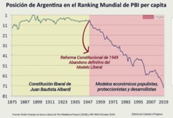 O gráfico acima ilustra a trajetória da decadência da Argentina. Sob uma constituição liberal tornou-se uma sociedade rica. A ponto de os europeus cunharem a expressão “rico como um argentino”. Sob a constituição socialista de 1949 tornou-se um pária internacional. Uma vergonha para os argentinos de bem… e um mau exemplo para os governos da América Latina e do mundo.