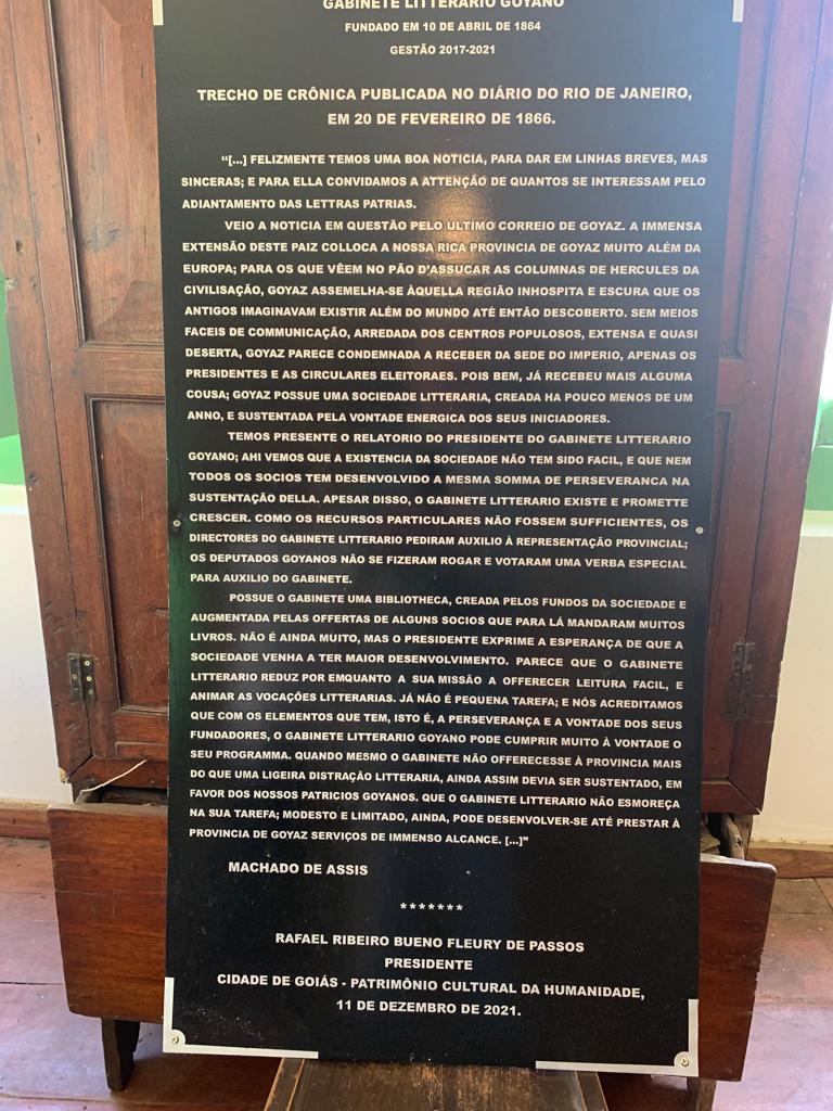 E a de que — sensacional descoberta de Rafael — nosso Machado de Assis, em crônica publicada no “Diário do Rio de Janeiro” de 20 de fevereiro de 1866, saudou a criação do Gabinete. “Que o Gabinete Litterário não esmoreça na sua tarefa; modesto e limitado, ainda, pode desenvolver-se até prestar à província de Goyaz serviços de inmenso alcance” — reza trecho da crônica. Crônica que Rafael Fleury fez gravar em bronze e fixar na entrada do casarão que abriga o Gabinete.