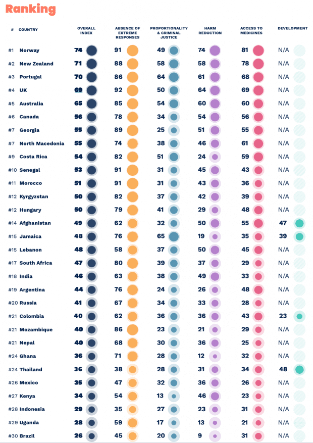 Um estudo, elaborado pela Harm Reduction Consortium, uma ONG ligada à ONU e financiada pela Open Society Foundations, foi publicado na semana passada, estabelecendo uma lista de 30 países pela efetividade de suas políticas de combate às drogas, por critério da mesma ONG. Esse critério leva em conta quatro fatores: Ausência de medidas extremas por parte do Estado no combate às drogas; efetividade da justiça criminal; políticas de redução de danos e assistência médica a drogados. O estudo abrange trinta nações e mostra como países mais efetivos, isto é, com melhores políticas no combate às drogas, Noruega, Nova Zelândia e Portugal. Aponta o Brasil em 30º lugar, ou seja, o último.